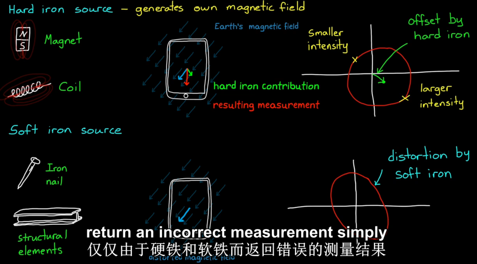2、mag会受到周围磁体的干扰,分为硬磁体和软磁体。硬磁体能够产生磁场,如磁铁和通电线圈,如图蓝色箭头表示地球磁场方向、绿色箭头表示硬磁体方向,他们的合成磁场为红色箭头,红圆代表没有硬磁体影响的磁场,随着绿色箭头的大小方向改变,实际测量结果轨迹为圆中心沿着绿色箭头偏移的大小相同的圆;软磁体是扭曲磁场分布的物体,比如任何金属,当磁力计旋转时,软磁体对于测量结果的影响是让正圆扭曲成了椭圆。