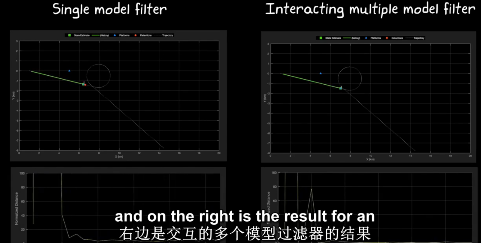滤波器性能评价指标:(3个方向的)归一化距离normalized distance。多滤波器模型比单个滤波器噪声更低(归一化距离越接近零表示跟踪性能越好)。