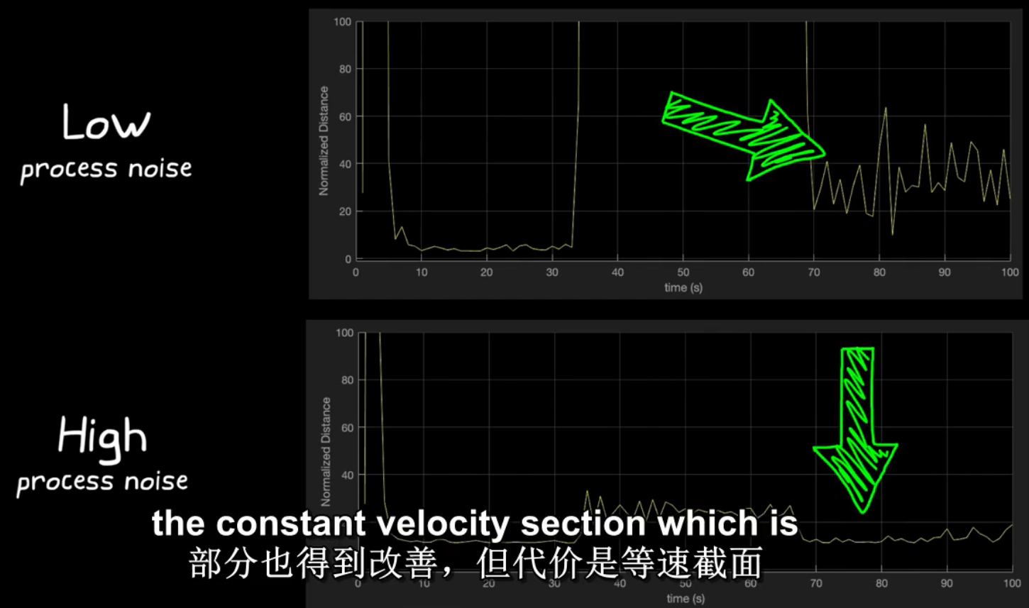 单个滤波器的问题在于噪声对于估计的影响。下图是某单个滤波器(constant velocity)在不同噪声设置下的归一化距离,当噪声设置低时,在匀速阶段的误差很小,在圆周和加速阶段误差大;当噪声设置高时,在圆周和加速阶段误差减小,但匀速阶段的误差提高。这样就失去了这个滤波器的特点(匀速时估计状态准确),所以对于不同阶段设置不同滤波器很有必要。