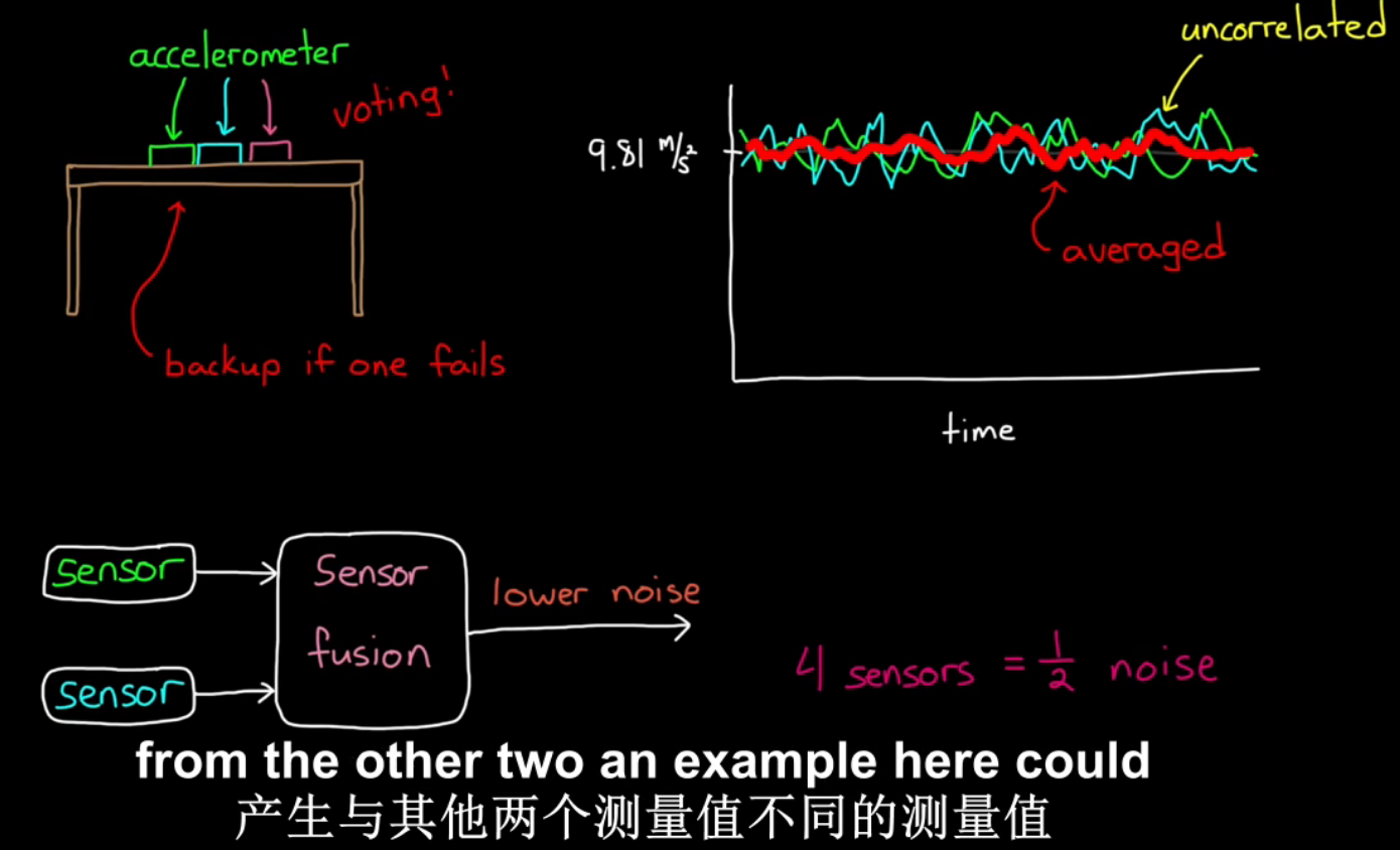 例1:测量加速度。将加速度传感器放在桌上,因为存在噪声,度数在9.8m/s2附近波动。多个传感器取平均值可将噪声降低。另外,多个传感器还能增加可靠性。