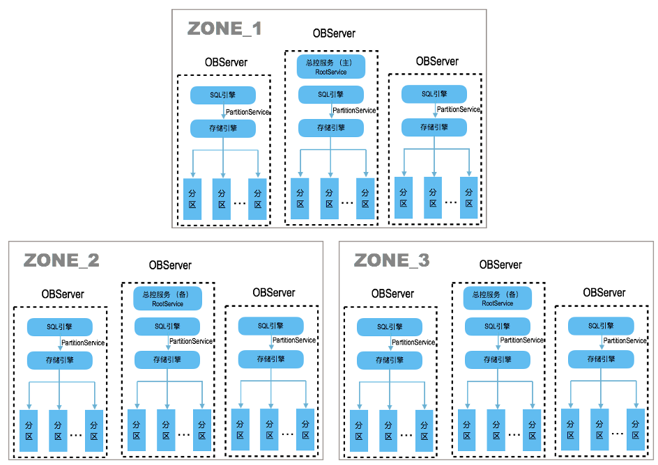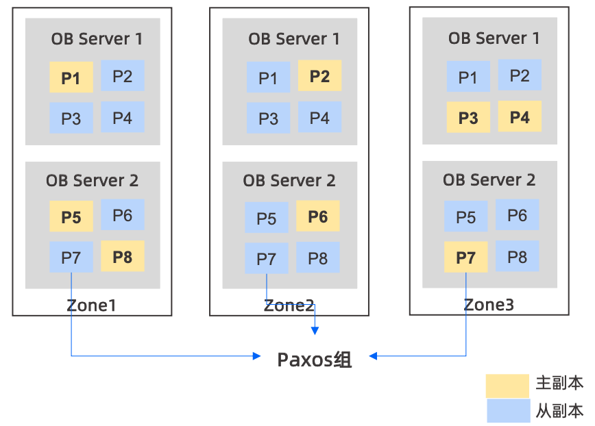 如上图有3个zone,8个分区,每个zone中有两个OBServer,每个分区都有三个副本,分布在不同zone中的OBServer上,OB以分区为最小单位组成Paxos组,通过Paxos保证了多副本之间的数据一致性,但Paxos需要多数派提交性能上不一定会比分库分表好。