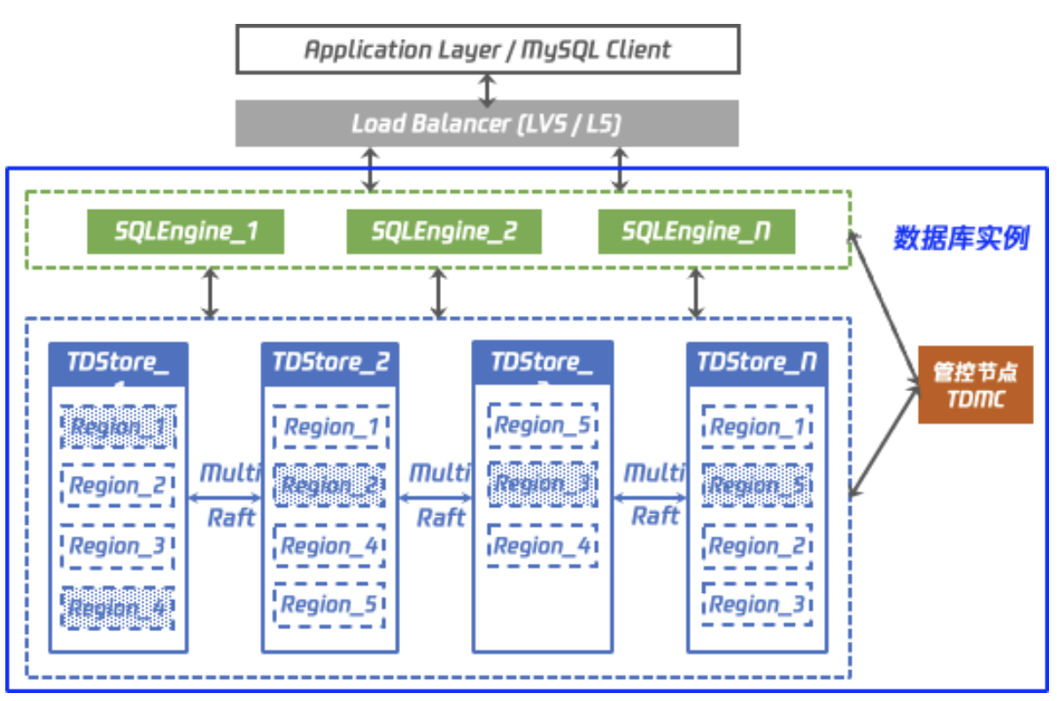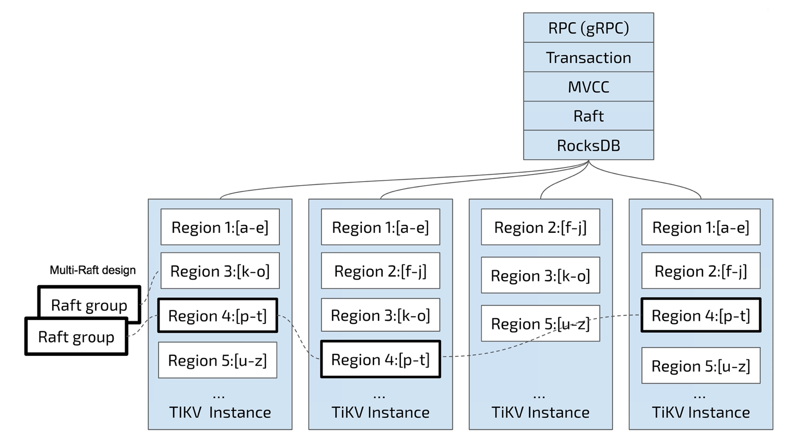 数据按Key切分为多个Region,PD负责将Region尽可能分布到不同的机器上,方便日后的扩容和Region的负载均衡,在Region内部数据是连续存储的,Region是三副本,使用Raft协议保证了一致性。