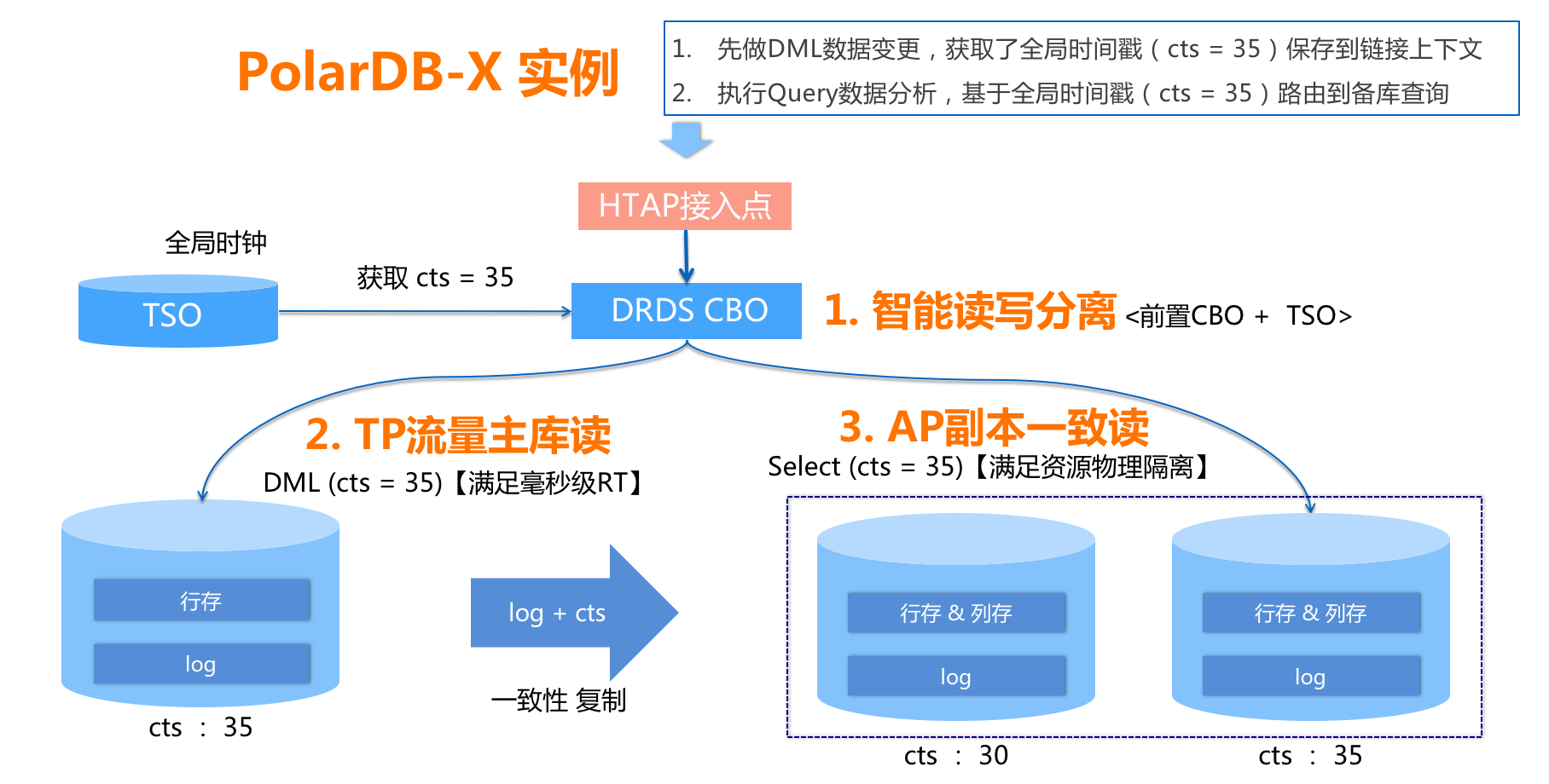 此外Polardb-X还通过只读节点,将AP与TP流量进行物理隔离,提供HTAP处理能力