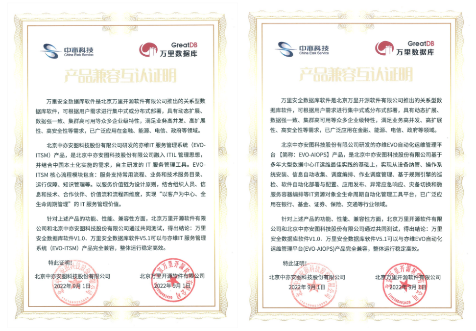 9月1日,北京中亦安图科技股份有限公司的亦维IT服务管理系统(EVO-ITSM)、亦维EVO自动化运维管理平台(EVO-AIOPS)、亦维灾备自动化管理系统(EVO-DR)与北京万里开源软件有限公司(简称:万里数据库)研发的万里安全数据库软件V1.0、V5.1顺利完成产品兼容性认证测试。