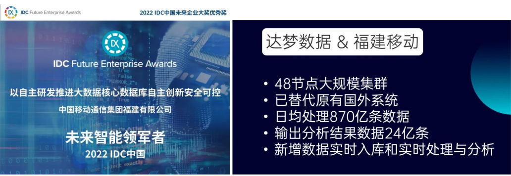 - 由武汉达梦助力福建移动的“以自主研发推进大数据核心数据库自主、创新、安全、可控”项目获得了公众和专家的一致好评,摘得了2022 IDC中国未来企业大奖优秀奖:未来智能领军者。
