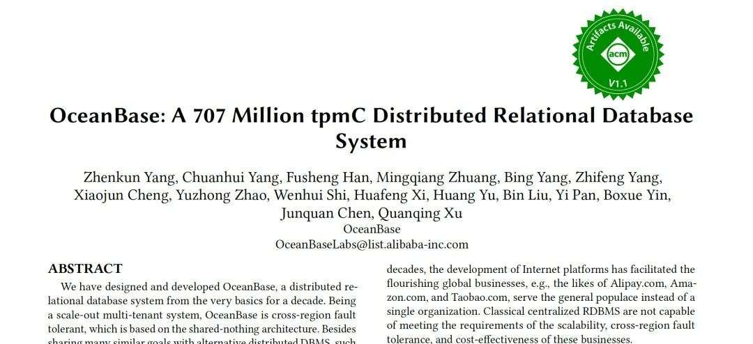 OceanBase 研究成果论文"OceanBase: A 707 Million tpmC Distributed Relational Database System"被 VLDB 2022 收录。 本次会议在分布式数据库研究领域共收录 5 篇来自全球的顶级学术成果,OceanBase论文被评为 VLDB 2022 分布式数据库领域唯一获得"the artifact available badge"的工业论文。