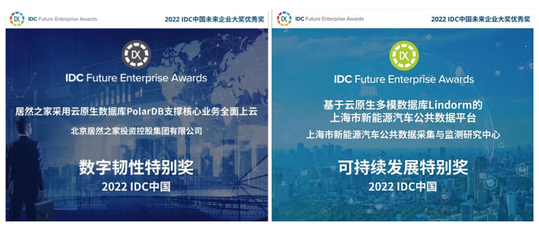 9月1日,IDC公布2022 IDC中国未来企业大奖获奖名单。阿里云数据库助力两家客户获得数字化转型奖项:居然之家“云原生数据库PolarDB支撑核心业务全面上云”案例获得“数字韧性特别奖”,上海市新能源汽车公共数据采集与监测研究中心“基于云原生多模数据库Lindorm的上海市新能源汽车公共数据平台”案例获得“可持续发展特别奖”。