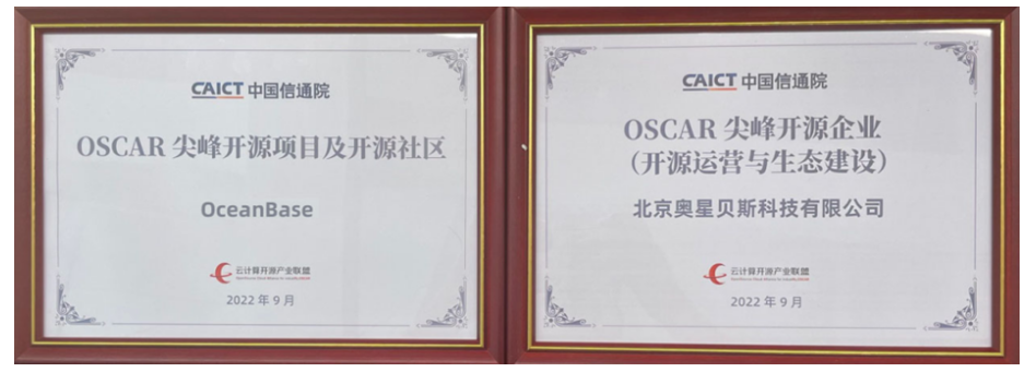 - OceanBase荣获“2022 OSCAR 尖峰开源项目和社区”、“2022 OSCAR 尖峰开源企业”奖项。