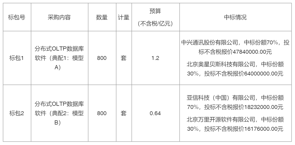 9月15日,中兴通讯、OceanBase、亚信AntDB、万里数据库4家联合中标“中移动信息2022-2023年分布式OLTP数据库及工具框架采购项目”。招标人为中移动信息技术有限公司,成交额合计1.45888亿元,预估采购规模1600套。