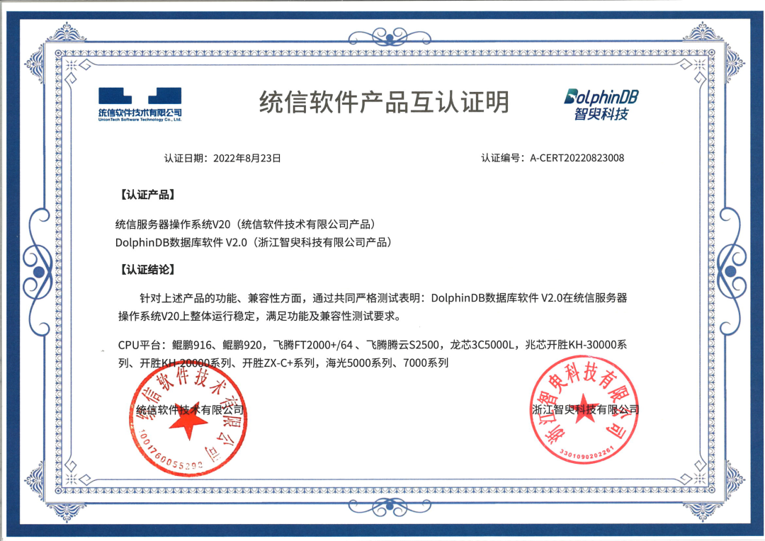 9月23日消息,近日,DolphinDB数据库软件 V2.0与统信软件技术有限公司的“统信服务器操作系统 V20(CPU:鲲鹏916、鲲鹏920、飞腾FT2000+/64、龙芯3C5000L等10个平台)”完成产品兼容互认证。经过双方共同严格测试,DolphinDB 产品运行稳定,满足功能及兼容性测试要求。