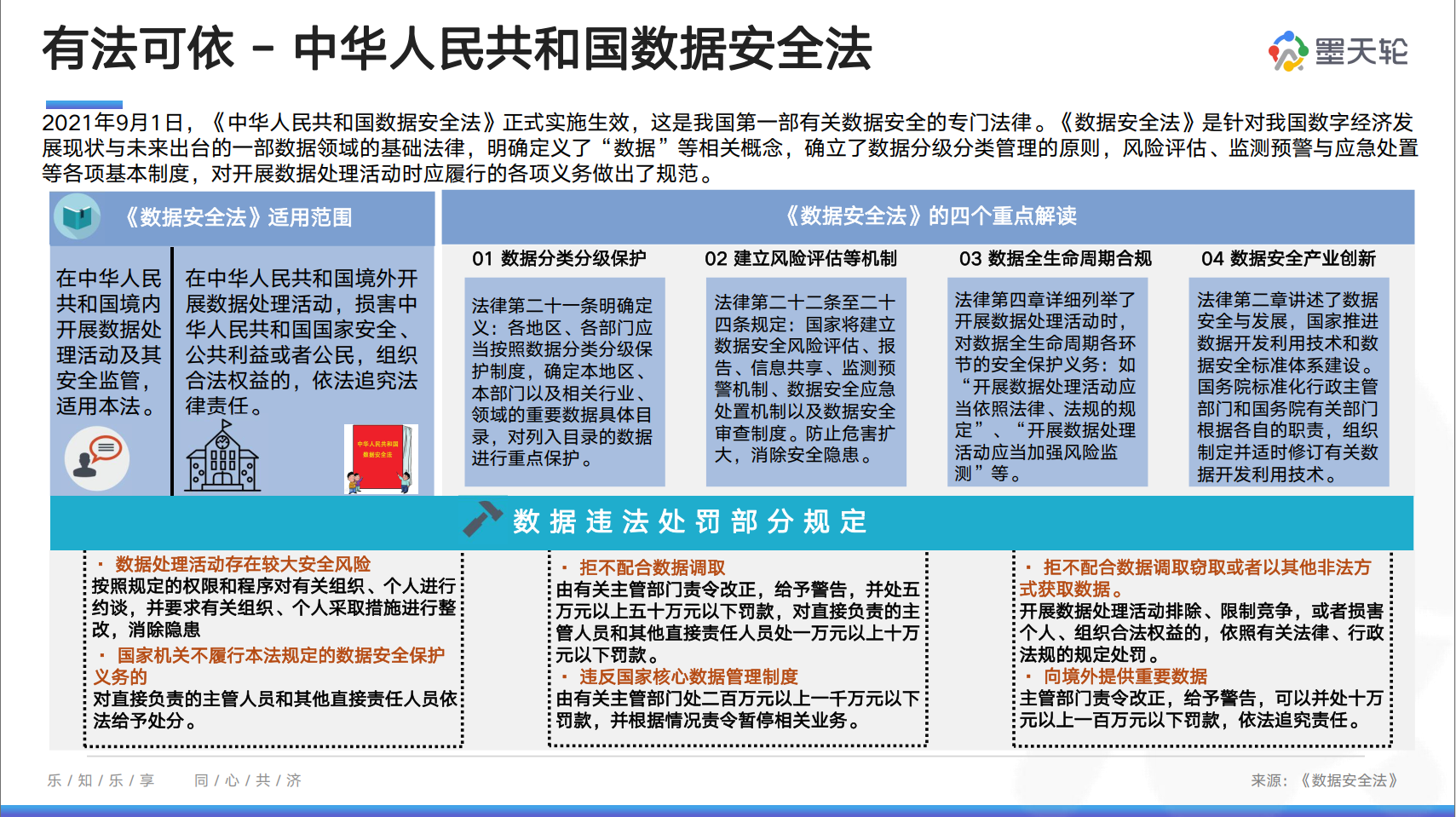 随着数据安全事件频发,各地也陆续出台相关法律法规,早在2021年9月1日,《中华人民共和国数据安全法》正式实施生效,这是我国第一部有关数据安全的专门法律。7月报告对其中的重点内容、违法处罚部分规定进行了详解介绍。