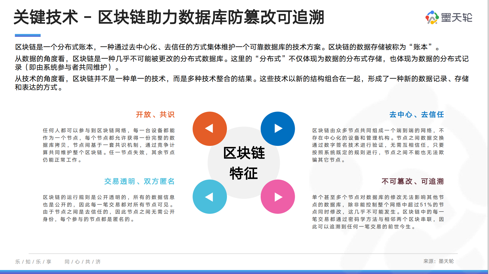 此外,报告对区块链、区块链表等技术进行了详解介绍,提供了去中心化、去信任的方式集体维护一个可靠数据库的技术方案。从技术的角度看,区块链并不是一种单一的技术,而是多种技术整合的结果。这些技术以新的结构组合在一起,形成了一种新的数据记录、存储和表达的方式。
