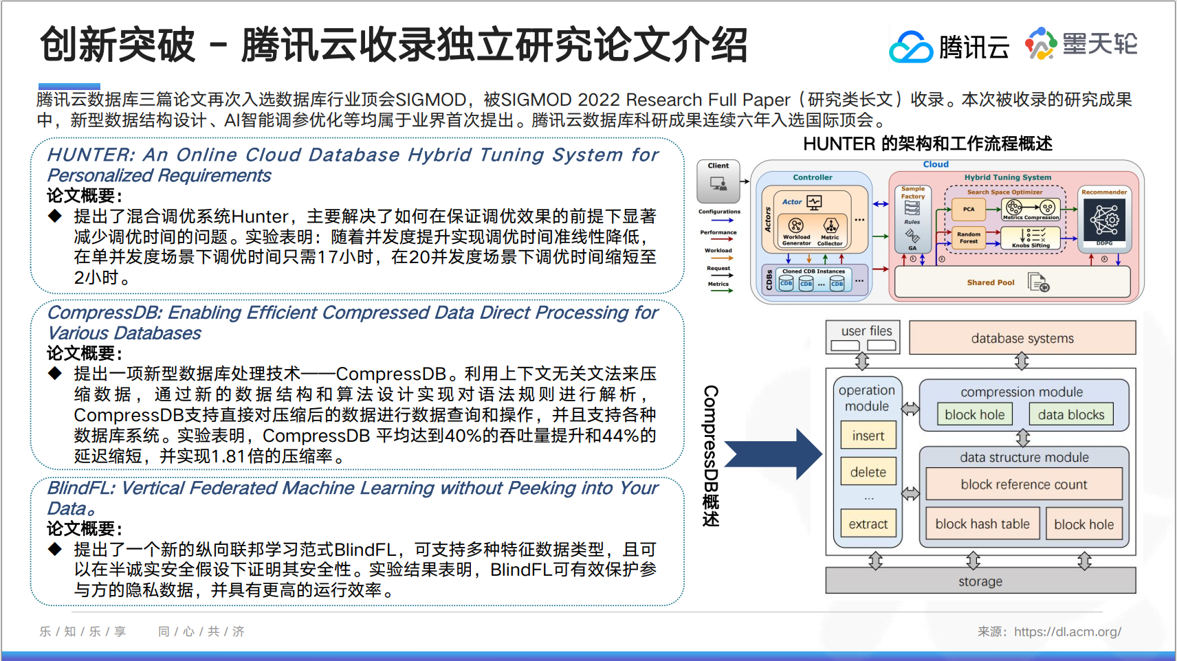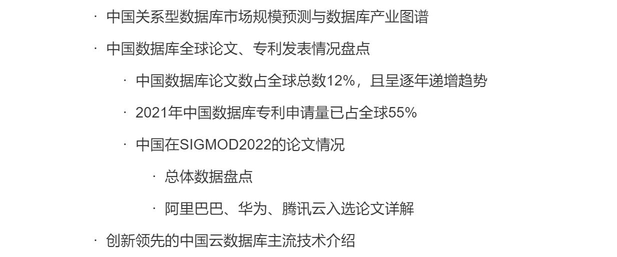 本月报告中对中国在SIGMOD2022(SIGMOD数据管理国际会议:由美国计算机协会(ACM)数据管理专业委员会发起)的论文发表情况进行了详细盘点,发现来自清华大学、香港中文大学、华为、阿里、腾讯等中国论文数收录占32%,这标志着中国数据库领域自主创新能力明显提升,并得到了业界的广泛认可。同时,报告对阿里巴巴、华为、腾讯云本次入选的11篇论文进行了详细解读,覆盖云原生、智能化等数据库前沿研究方向,各位朋友可以阅读报告查看详情。