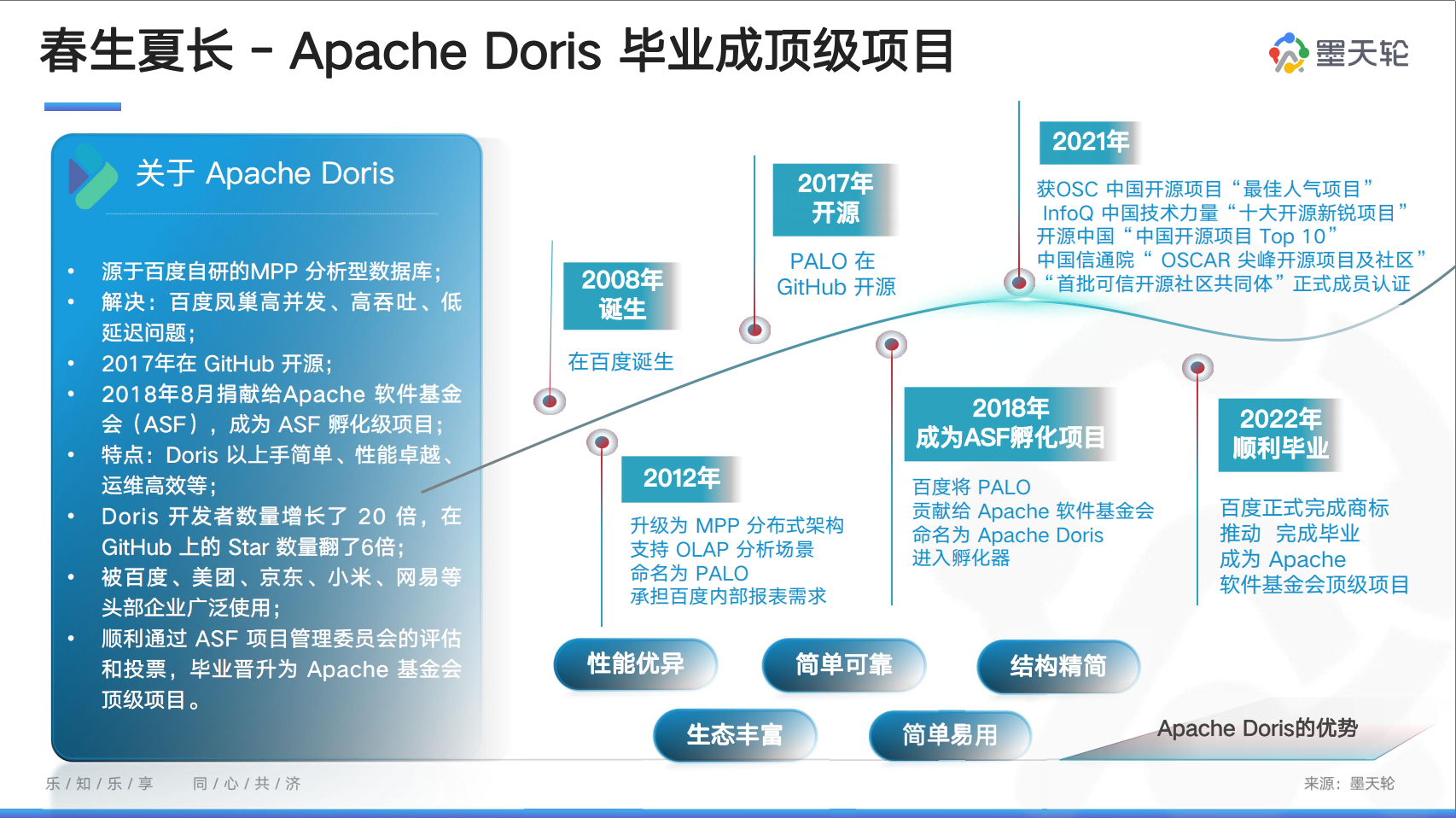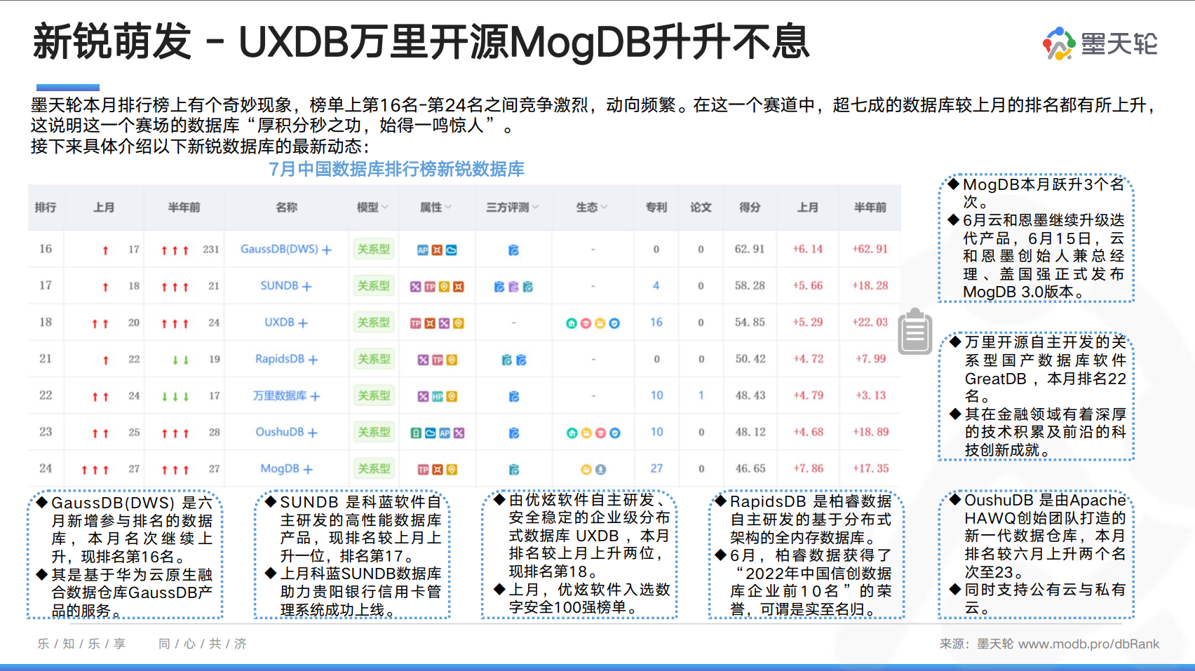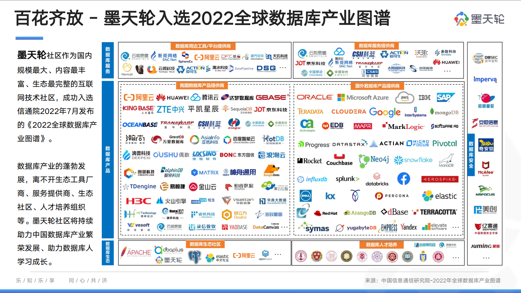7月8日,中国信息通信研究院联合中国通信标准化协会在京召开了2022可信数据库峰会,正式发布《全球数据库产业图谱(2022)》,旨在全面客观展现全球数据库产业中的关键领域、环节和代表企业。墨天轮社区作为国内规模最大、内容最丰富、生态最完整的互联网技术社区,成功入选。
