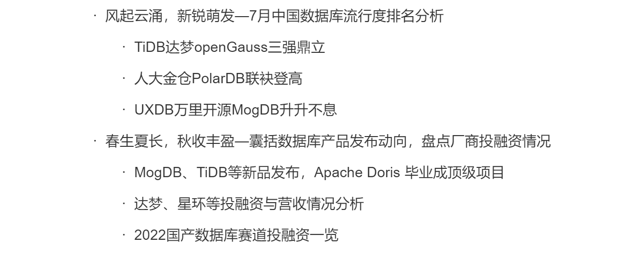 本月,数据库行业也迎来了多个新产品、新版本的更新发布,国内诸如MogDB 3.0 发布、TiDB 6.1 发布、MatrixDB v4.5.0 发布、StoneDB 开源以及源于百度自研的 MPP 分析型数据库Apache Doris 毕业成顶级项目。国外产品则包括Snowflake发布 Unistore,进军 HTAP 市场以及MongoDB 6.0 发布,首创“可查询加密”等。(报告文档中皆已进行介绍,此处不做过多展示)