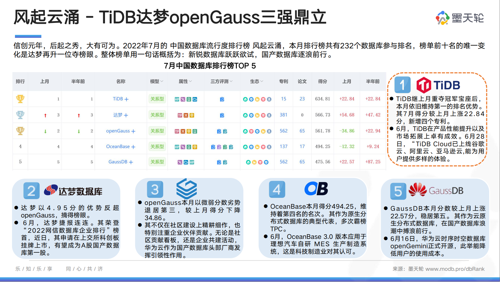 7月的中国数据库流行度排行榜风起云涌,相比上月新增 ShuangzhaoDB 一个数据库。榜单前十名中,TiDB 依旧维持第一的排名优势,达梦较上月再升一位夺榜眼,openGauss 回落到榜单第三名。整体榜单用一句话概括为:新锐数据库跃跃欲试,国产数据库逐浪前行。