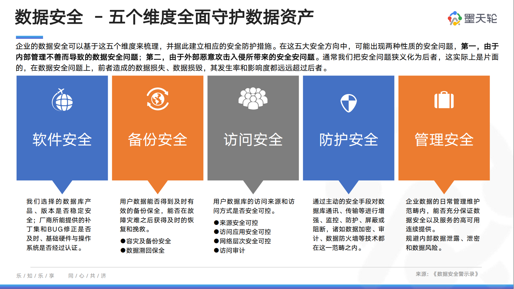 在《数据安全警示录》中介绍了软件安全、备份安全、访问安全、防护安全和管理安全五个维度,企业可以以此梳理并建立相应的安全防护措施。