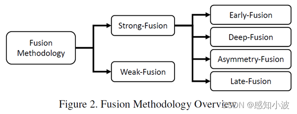 然而,最近的工作不能轻易地分为这三类。因此,在本文中,我们提出了一种新的分类法,将所有融合方法分为强融合和弱融合,我们将对此进行详细阐述。我们在图2中显示了它们之间的关系。