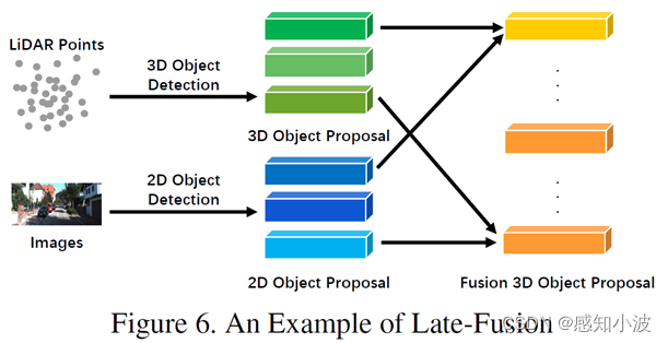 后期融合, 也称为目标级融合,表示融合每个模态中管道结果的方法。例如,一些后期融合方法利用激光雷达点云分支和相机图像分支的输出,并基于两种模式的结果进行最终预测。请注意,两个分支proposals的数据格式应与最终结果相同,但在质量、数量和精度上有所不同。后期融合是一种利用多模态信息对最终方案进行优化的集成方法。图6中的模型可以是后期融合的一个例子。
