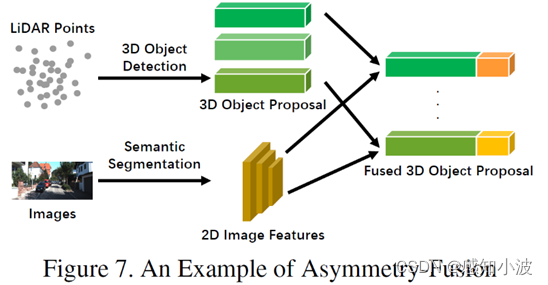 不对称融合,除了早期融合、深度融合和后期融合外,一些方法还处理具有不同权限的跨模态分支,因此我们将一个分支的目标级信息融合,而其他分支的数据级或特征级信息融合定义为非对称融合。与强融合中的其他方法不同,非对称融合将两个分支视为似乎相等的状态,非对称融合至少有一个分支占主导地位,而其他分支提供辅助信息来执行最终任务。图7中的模型可以是延迟融合的一个例子。特别是与后期融合相比,虽然它们可能使用proposal具有相同的提取特征[55],但不对称融合只有来自一个分支的一个proposal,而后期融合有来自所有分支的proposal。