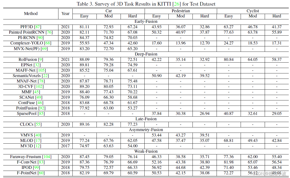 为了进行性能比较,我们主要关注KITTI benchmark中的两个主要任务,即3D检测和鸟瞰目标检测。表2和表3分别给出了BEV和3D设置的KITTI测试数据集上最近的多模态融合方法的实验结果。