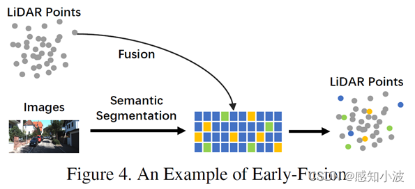 早期融合: 与传统的数据级融合定义不同,后者是一种在原始数据级通过空间对齐和投影直接融合每种模态数据的方法,早期融合在数据级融合激光雷达数据数据级融合,相机数据在级别或特征级别。 早期融合的一个例子如图 4所示。