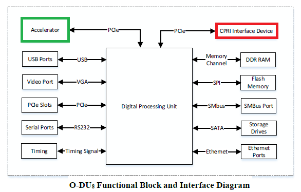 PCIe: PCIe v3或更高版本,用于连接DU所需要的硬件加速器。之所以选择PCIe这个接口,这是因为PCIe是通用计算机连接即插即用模块的标准接口。