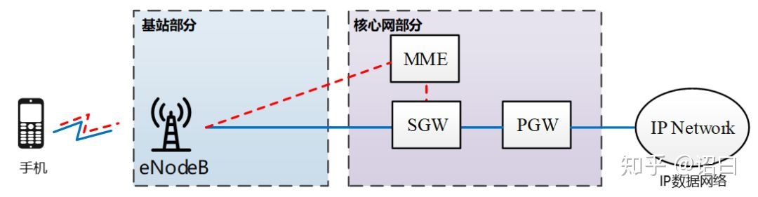(注意,基站里面的RNC没有了,为了实现扁平化,功能一部分给了核心网,一部分给了eNodeB)