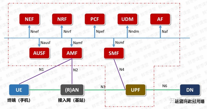 红色虚线内为5G核心网,除了UPF之外,都是控制面