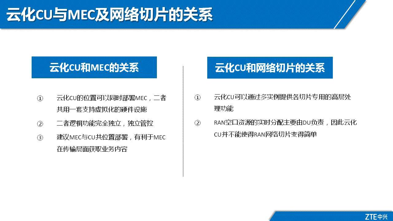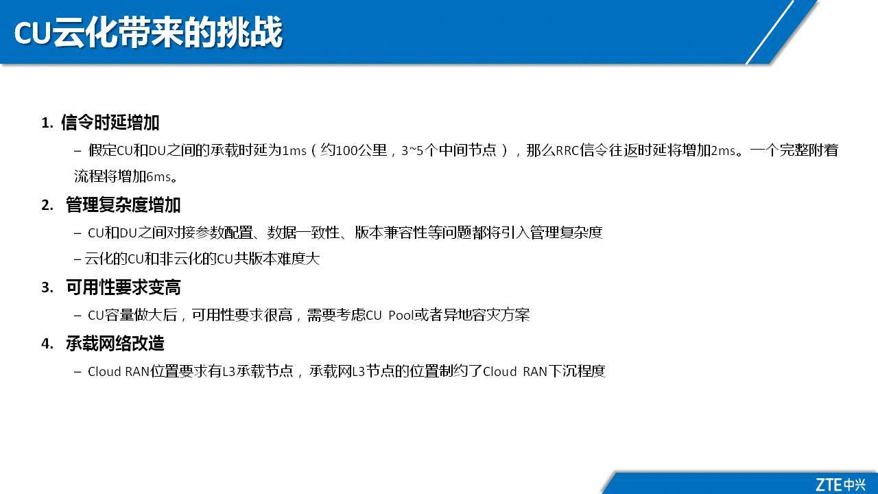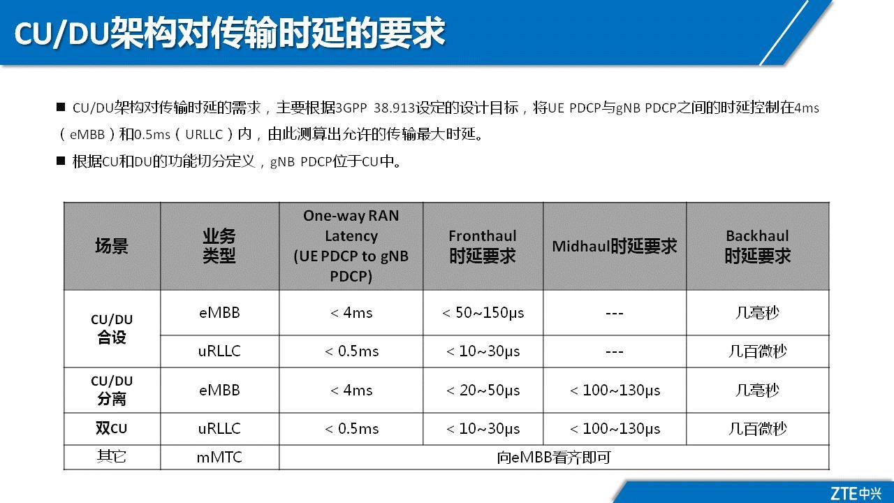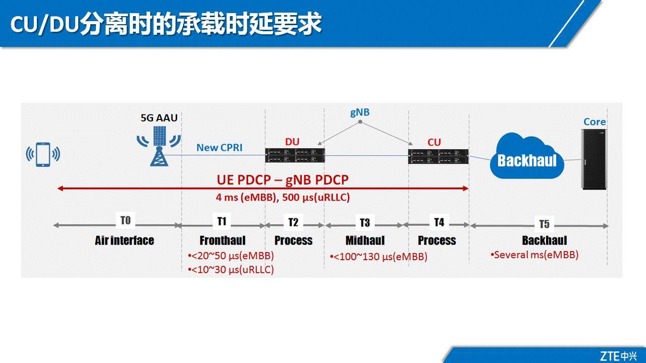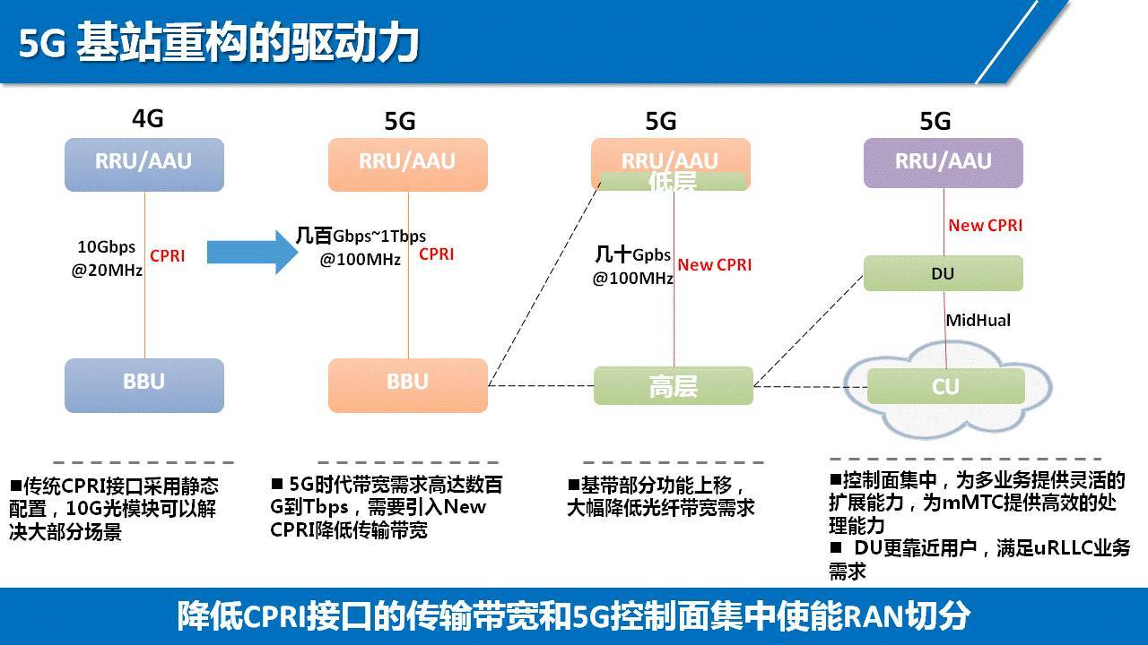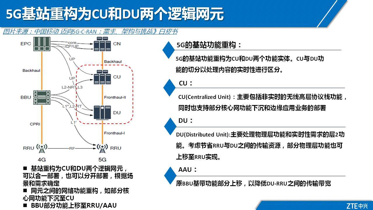 5G的基站功能重构为CU和DU两个功能实体;CU与DU功能的切分以处理内容的实时性进行区分。