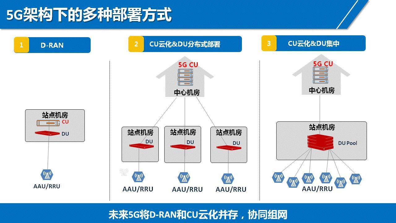 5G NR基站重构为CU和DU两个逻辑网元,根据场景和需求可以合一部署、也可以分开部署;