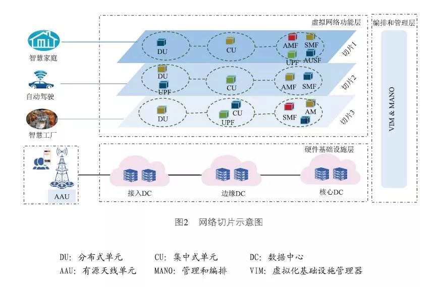 网络切片的部署如图2所示,与传统移动通信网络固定的网络架构相比,网络切片包含的NF按需设计,切片中仅包含为支持应用所必须的NF,避免包含其他非必要的NF。另外,具备相同功能的NF在不同网络切片部署的位置也可能不同。例如,对于车联网应用要求网络具备超低时延,因此提供用户面数据交换的UPF需要下沉至接入数据中心部署,而对于其他应用的网络切片,UPF通常部署在核心数据中心。对于车联网等应用通常要求网络部署移动性功能,而对于远程医疗应用不需要移动性,因此对应的网络切片在编排部署过程中就不需要包含移动性功能。