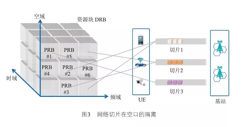 接入网络由无线空口和基础处理资源构成。如图3所示, 5G正交频分多址(OFDMA)系统中,无线频谱从时域、频域、空域维度被划分为不同的资源块,用于承载数据在无线空口的传输。无线频谱资源的隔离可以分为物理隔离和逻辑隔离。物理隔离是给网络切片分配专用频谱带宽,这时分配给切片的资源块是连续的。逻辑隔离是资源块按照不同切片的要求按需分配,这时分配给每个切片的资源块是不连续的,多个切片共享总的频谱资源。