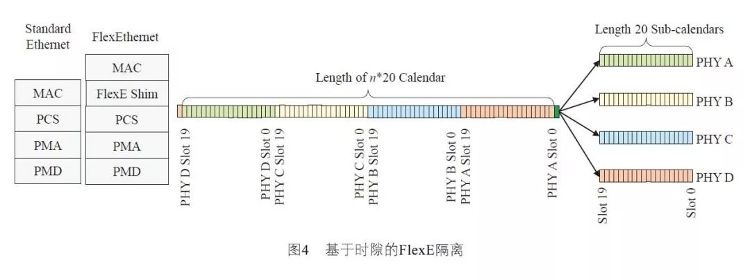 硬隔离方案基于灵活以太网(FlexE)技术。 FlexE技术由光互联论坛(OIF)定义 [5] ,如图4所示,通过在以太网的物理编码子层(PCS)引入一个时分复用(TDM)的Flex垫层(Shim),实现了 MAC层和PHY层接口收发器的解耦,从而提升以太网组网灵活性 [6] 。 FlexE使用 Calendar分配每个子 Calendars上的66比特块给 FlexE客户(网络切片)。每 100G物理介质相关子层(PMD)分为20个时隙,颗粒度是 5G。 FlexE Shim层有 n×10个5G时隙。 FlexE客户的 64B/66B按照时隙方式插到 FlexE Shim层。 FlexE客户的 10G、25G、40G、n×50G分别在 Shim层占用 2、5、8、n×10个5G时隙。 FlexE客户在 FlexE Shim层占用时隙采用灵活方式,通过 FlexE开销指明时隙被哪个业务占用。 FlexE通过 Shim层的时隙配置支持多个客户业务,实现承载不同客户业务的网络切片之间的物理隔离。基于时隙调度的 FlexE分片将物理以太网端口划分为多个以太网弹性管道,使得承载网络既具备以太网统计复用、网络效率高的特点,又具备类似于 TDM独占时隙、隔离性好的特性。