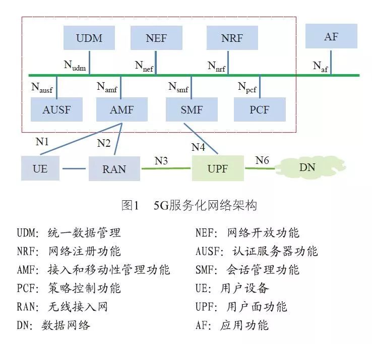 行业应用是多样化的,甚至有些应用是小众化、短生命周期的,它们对网络性能的需求也是差异化的,例如用于工业控制的网络需具备较小的时延,而对于固定终端的传感器网络不需要网络具备移动性功能。传统移动网络基于专用设备组网,网元功能以专用设备形态存在,在组网、网络扩容、提供差异化网络服务等方面不够灵活,运维复杂、建设维护成本较高,因此传统移动网络难以满足多样化应用所需的差异化服务需求,难以快速响应应用需求的变化,也无法承担碎片化运营带来的运营成本。为了更好地满足差异化服务的需求,提高网络系统部署灵活性,降低网络建设运维成本, 5G网络采用了服务化网络架构 [2] ,引入虚拟化、网络能力开放、网络切片等新技术,从而具备高度可定制性。垂直行业可以结合应用需求,基于开放的网络能力定制服务网络,并且可以灵活地对网络容量进行弹性伸缩,以应对动态变化的需求。 5G服务化网络架构如图1所示。