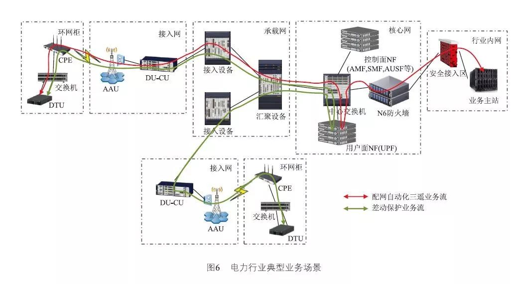 电力行业是 5G技术探索的行业应用之一 [9] 。差动保护和配网自动化三遥是电网中两类典型的业务。两类业务可以由一个智能电力终端(DTU)承载。智能 DTU通过 CPE接入 5G网络。 CPE作为 5G网络的接入终端,配备一张 SIM卡。差动保护业务通过 5G网络实现在两个 DTU之间交互,而配网自动化三遥业务由 DTU经过 5G网络流向业务主站,如图6所示。两类业务对外需要实现物理隔离,两类业务之间需要实现逻辑隔离。