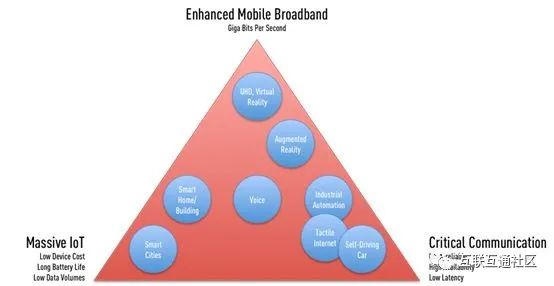 5G会继续提供和增强(eMBB)4G的功能,提供更高的带宽,来满足视频流和AR/VR等应用的需求,同时,它也开启了大规模物联网和高可靠低时延通信的应用场景。
