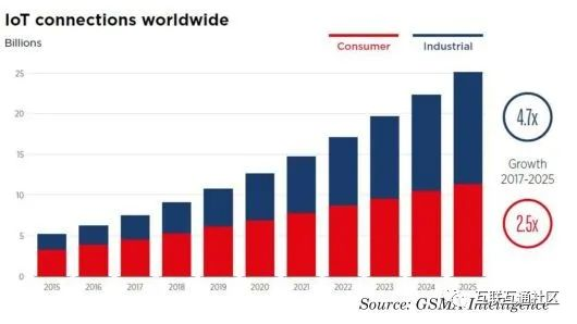 家庭物联网中越来越多的设备为硬件制造商提供了巨大的机会,但真正的潜力在于工业物联网。在全球范围内,到2023年,工业连接基础将超过消费者物联网连接。根据GSMA Intelligence的数据,2017年至2025年,全球IoT连接(蜂窝和非蜂窝)的数量将增长三倍多(从7.5增至251亿)。