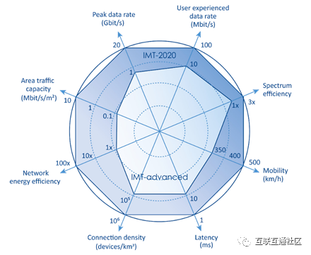 根据ITU-R M.2083,IMT-Advanced[2](第四代)与IMT-2020[3](第五代)的关键功能比较: