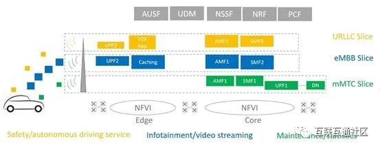 V2X是5G网络切片应用的一个很好的例子,汽车将混合使用各种服务,包括大量的IoT设备(比如传感器),大带宽的娱乐系统,和低时延的监管服务或自动驾驶类的紧急服务。它们分别对应于三大基础场景:mMTC(机器类型通信),eMBB(增强型移动宽带)和uRRLC(超低延迟)。