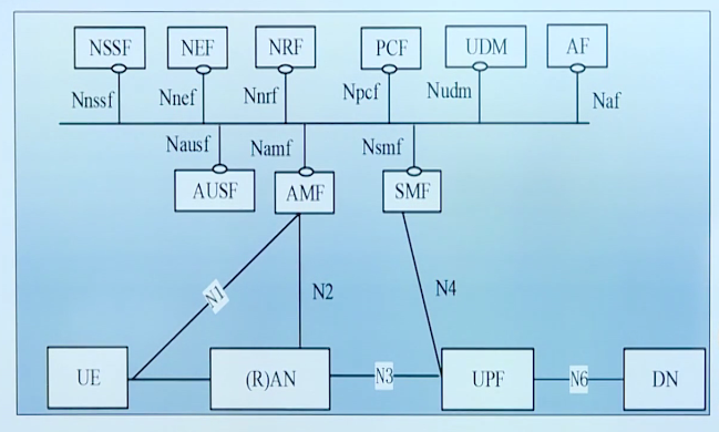 5G的组网架构图如下,5G的组网架构是一种服务化的组网架构,与4G不同的是: