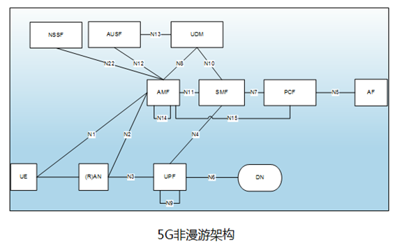 在5G非漫游架构中,NRF与NEF并未标注,NRF是用于进行网元登记的,而NEF是介于第三方应用体与核心网之间