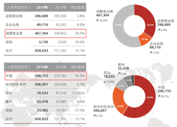 分业务看,运营商业务2967亿元,同比增长3.8%;企业业务收入897亿元,同比增长8.6%;消费者业务收入4673亿元,同比增长34%。