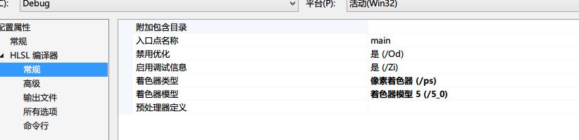 “常规”子支中,入口点名称随意,着色器类型选择像素着色器,着色器模型选择5.0