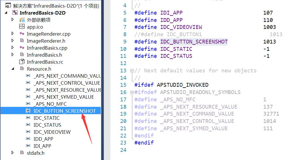 在文件InfraredBasics.h的构造函数中添加一行 bool m_bSaveScreenshot; 为按钮的按下和松开绑定一个状态量