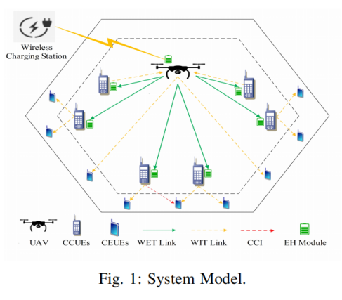 模型:首先,中心用户在时间用UAV的信号中获取能量,然后使用获取到的能量,中心用户可以直接和边缘用户通信或作中继时UAV和边缘用户通信。