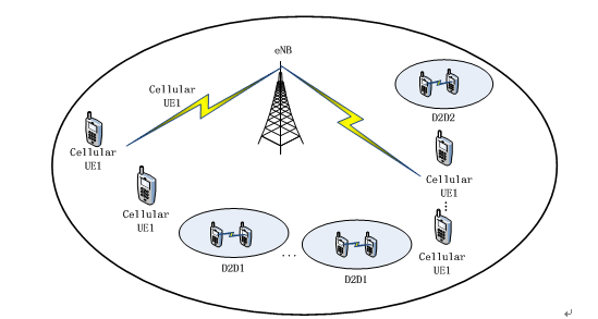 给单个天线的用户,。每个蜂窝用户包括D2D设备配备单根天线。假设蜂窝网络中存在个蜂窝用户,表示;并且在蜂窝网络中存在D个可能的D2D通信对,用表示。每个D2D通信对由发射端和接收端组成。