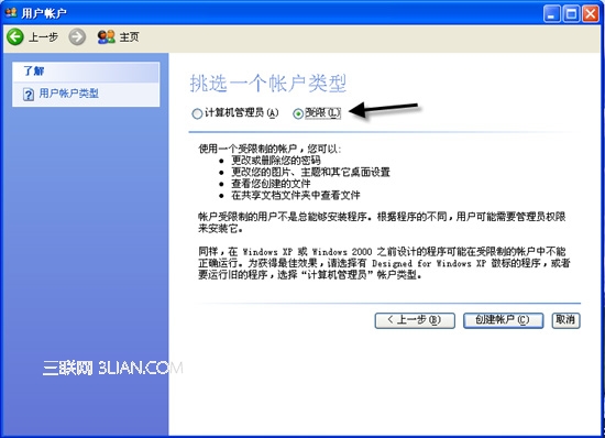使用具有管理权限的帐户登录,在控制面板中打开“用户帐户”设置窗口,你将能看到图一的界面。在“挑选一项任务”选项下点击“创建一个新帐户”,接着系统需要你提供帐户的用户名,输入完成后点击下一步,接着需要选择帐户的类型(图二)。默认情况下windows xp提供了两种类型的帐户:计算机管理员和受限制帐户。顾名思义,计算机管理员是对计算机有最高控制权限的人,这类帐户可以对系统进行任何设置,查看、修改或者删除计算机上的所有文件。因此我们在创建这种帐户的时候一定要小心,因为使用这类帐户的用户错误的设置可能会造成很严重的系统障碍。安全起见也不建议日常使用中使用管理员帐户。所以这里我们选择帐户类型为“受限制用户”。接着我们分别为老爸、老妈和妹妹每人创建一个受限制帐户。