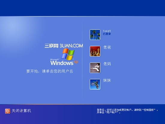 以后启动计算机后将不会立刻出现桌面,而是出现类似图三的欢迎屏幕。在欢迎屏幕上,每个用户可以点击自己的帐户名并输入密码(如果需要的话)登录进Windows。每个用户使用自己的帐户登录后都能看到完全一样的初始桌面设置,而他们在这个桌面上进行的任何修改(例如添加或删除某个桌面快捷方式,或者更换墙纸)都只对自己生效,不会影响到别人。