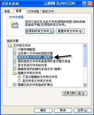 使用具有管理权限的帐户登录,在windows xp中,打开我的电脑,然后在“工具”菜单下点击“文件夹选项”,打开文件夹选项的“查看”选项卡。在这里,取消对“使用简单文件共享(推荐)”的选择(图五)。